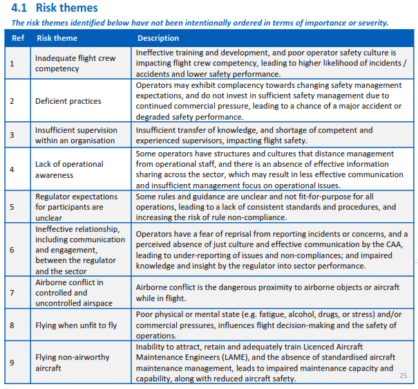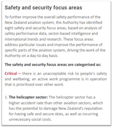 The CAA has made its own assessment of the helicopter sector and thinks that it presents an unacceptable risk to people’s safety and wellbeing. They briefed the Minister for Transport that their only critical safety issue is with helicopters, and that this focus drives their work on a day-to-day basis, with an active work programme that is prioritised over other work: