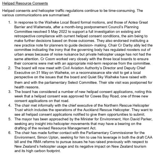 The Waiheke Local Board chair has also commented thus as part of an update to the Local Board: