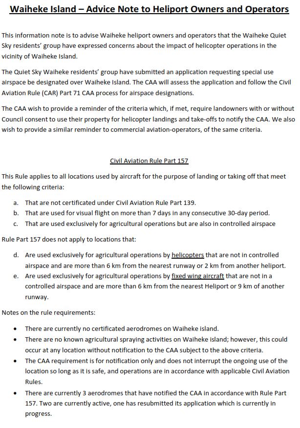 This report was issued by the Helicopter Association International, and industry group, to urge helicopter pilots to cause less nuisance to the public. It contains many recommendations about noise reduction, including flying at a higher altitude of 2000 feet, staying over water, avoiding sharp movements, reducing speed, and making a steep descent to landing. Quiet Sky Waiheke believes that mandating such measures over Waiheke, with enforcement, could greatly lessen the noise pollution we suffer.
