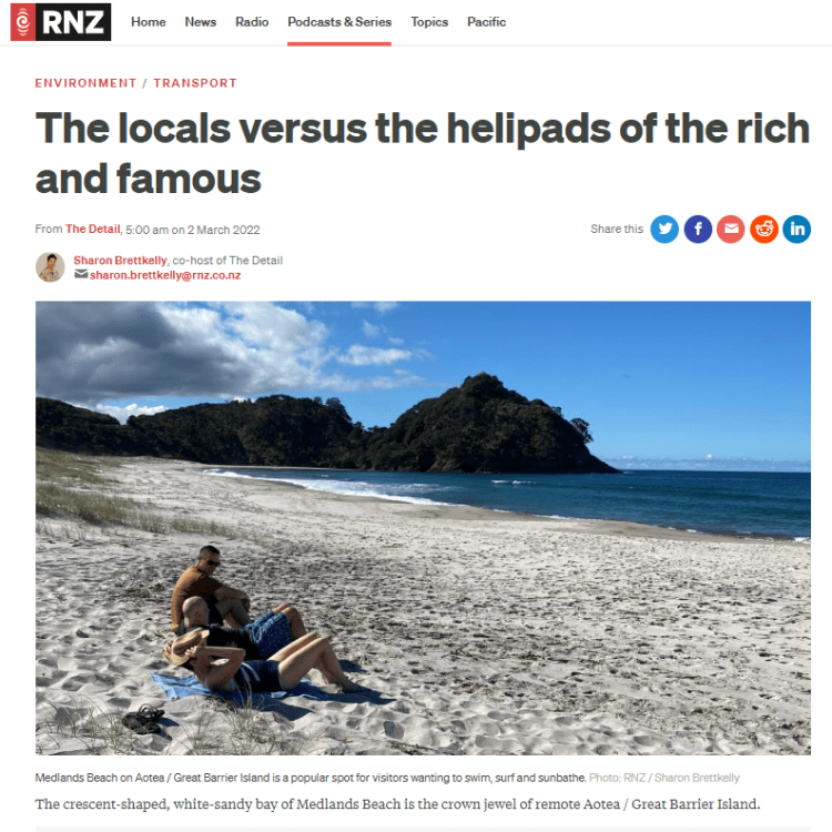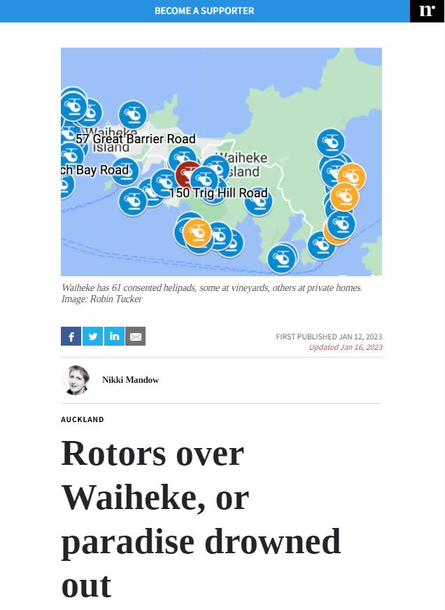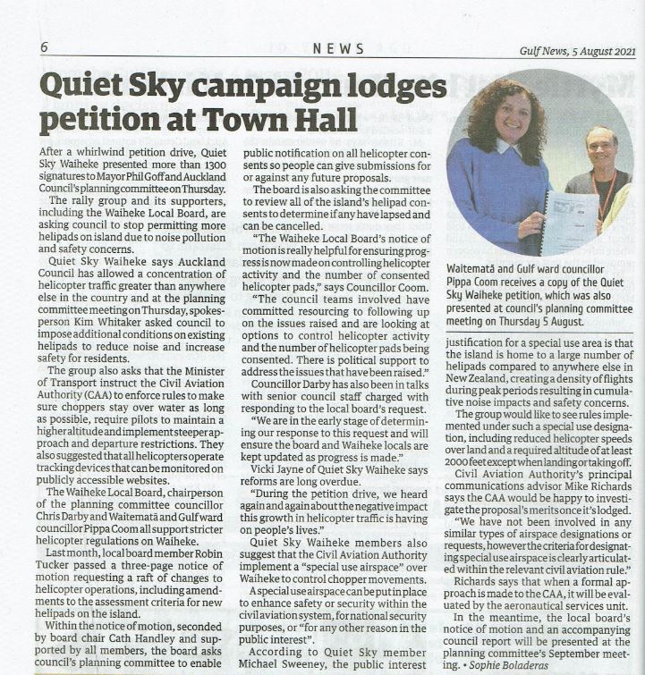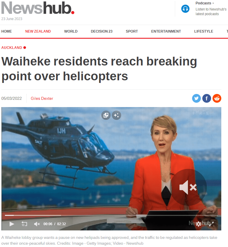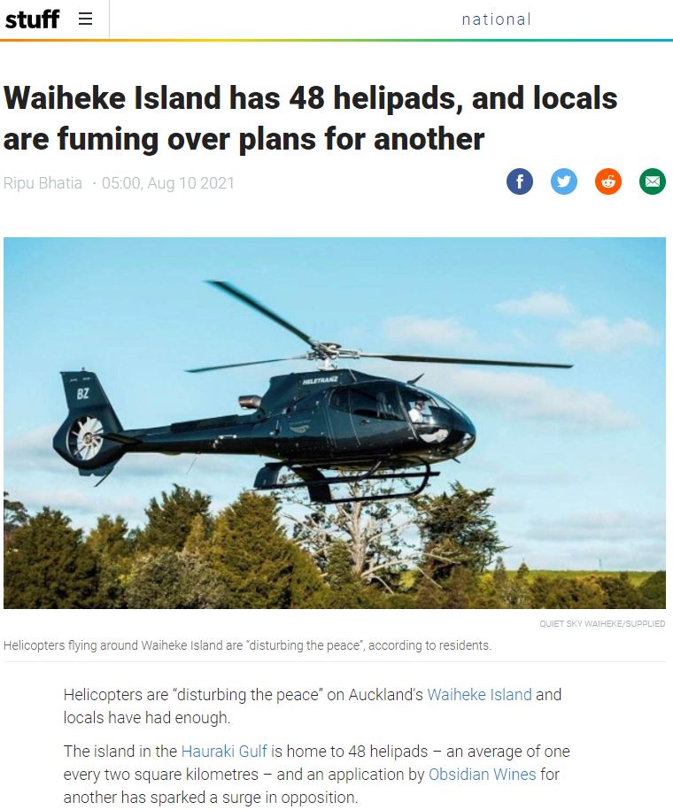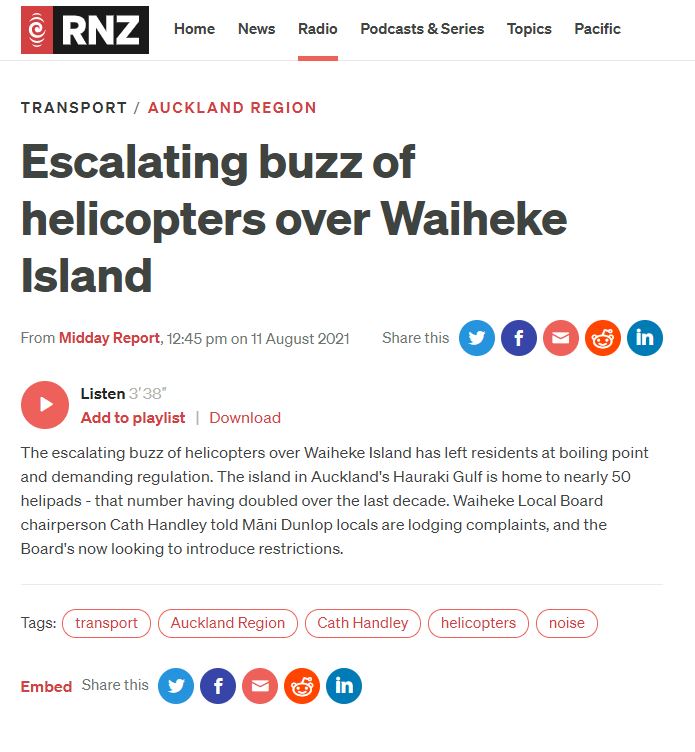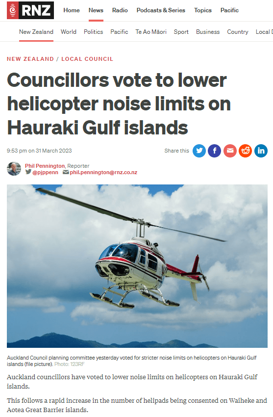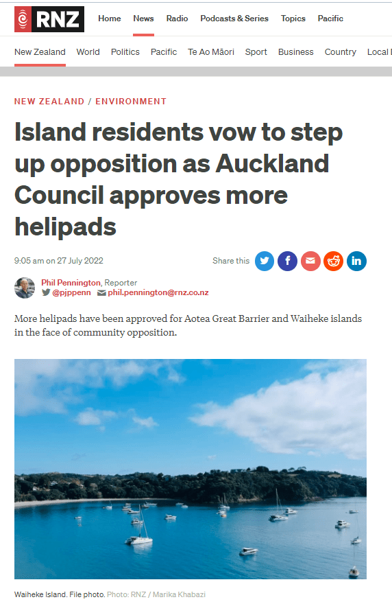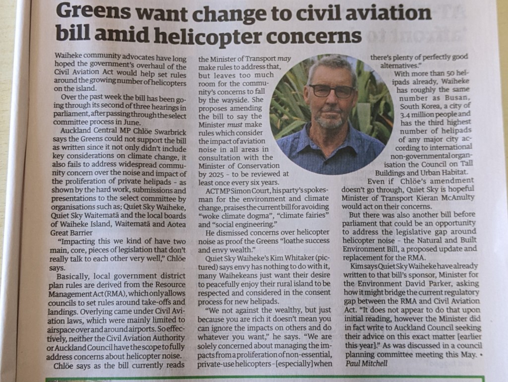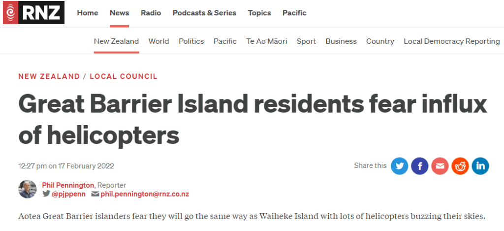 Great Barrier residents are also reeling from unprecedented applications for private helipads on the island. Listen to Radio New Zealand’s interview with Aotea Great Barrier Local Board Chair, Izzy Fordham. Contributions are also made by Quiet Sky’s Kim Whitaker and Waiheke Local Board Chair Cath Handley. You can also read the accompanying article.