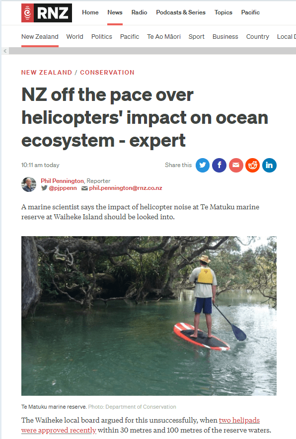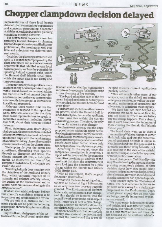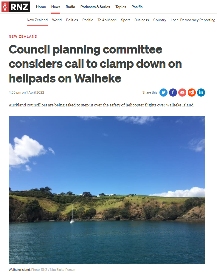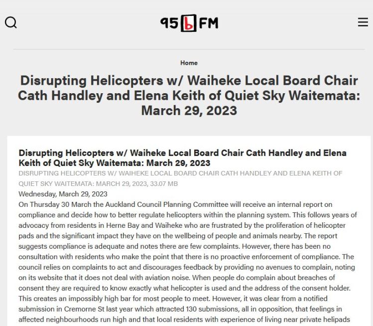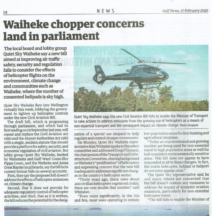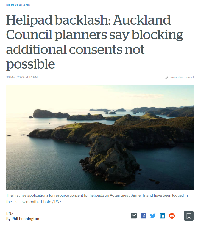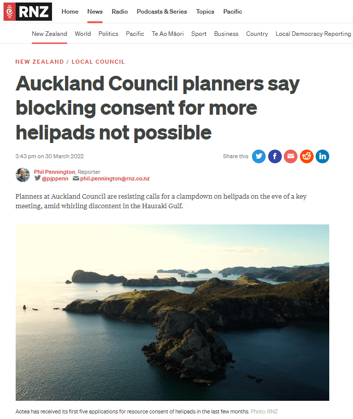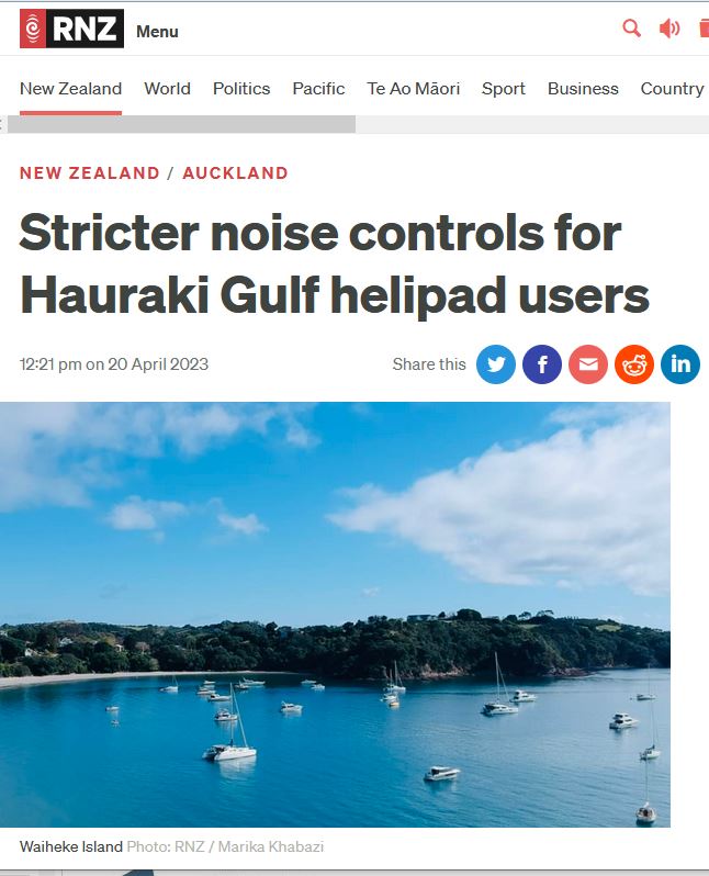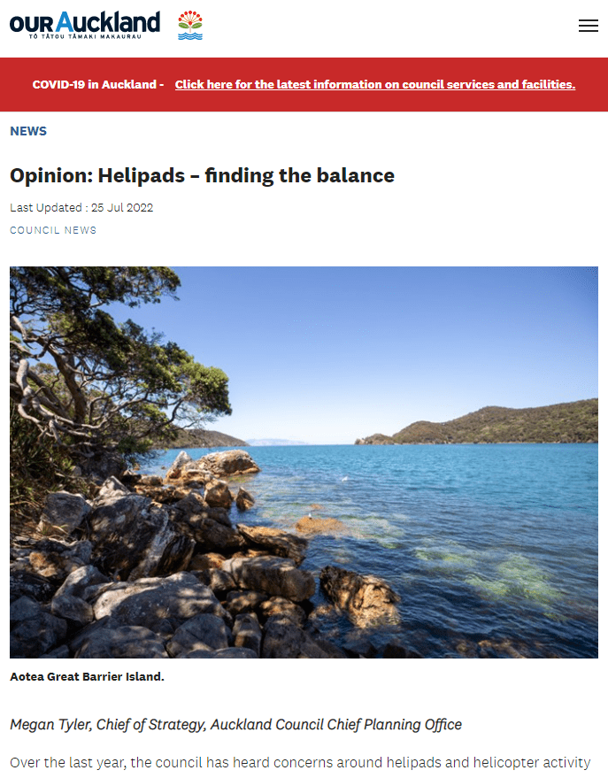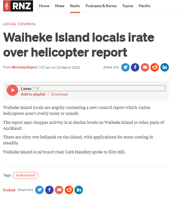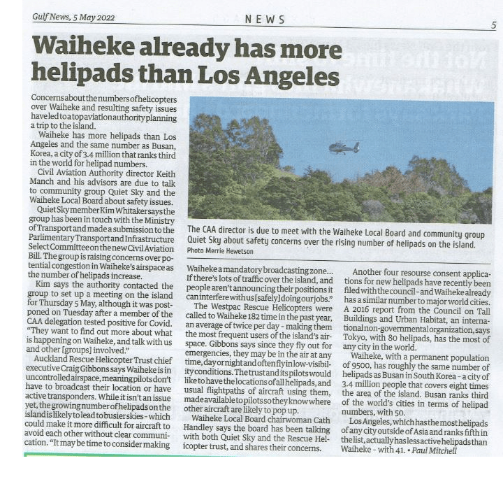 Great Barrier residents are also reeling from unprecedented applications for private helipads on the island. Listen to Radio New Zealand’s interview with Aotea Great Barrier Local Board Chair, Izzy Fordham. Contributions are also made by Quiet Sky’s Kim Whitaker and Waiheke Local Board Chair Cath Handley. You can also read the accompanying article.