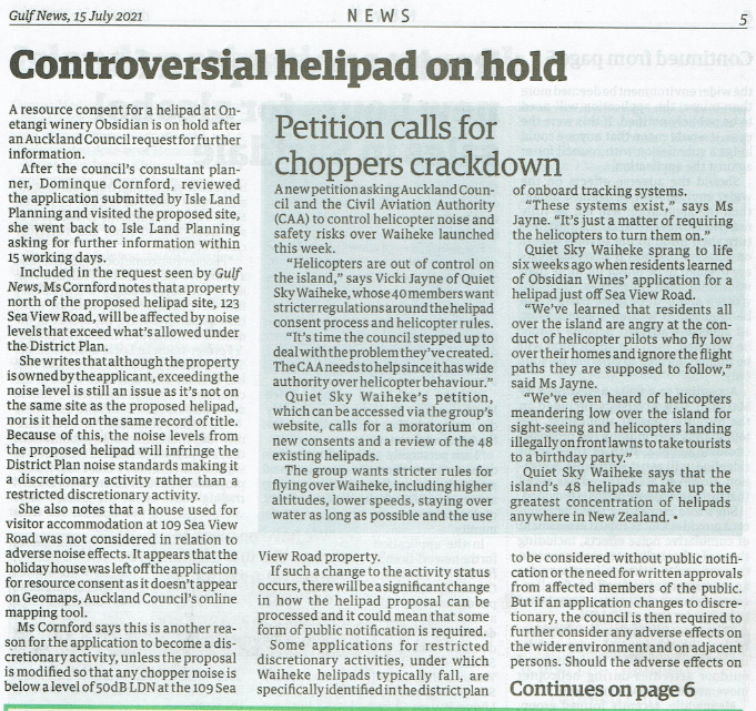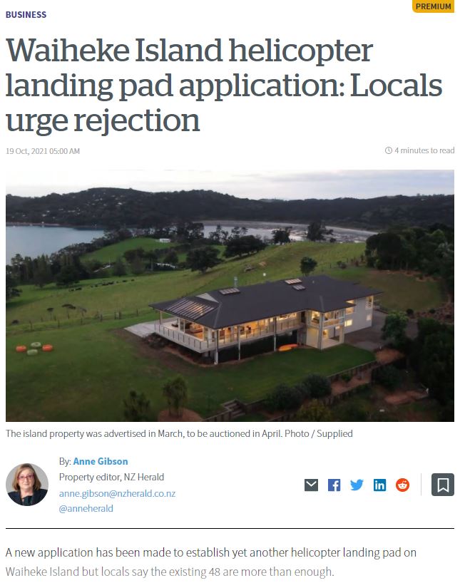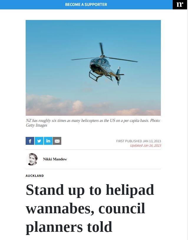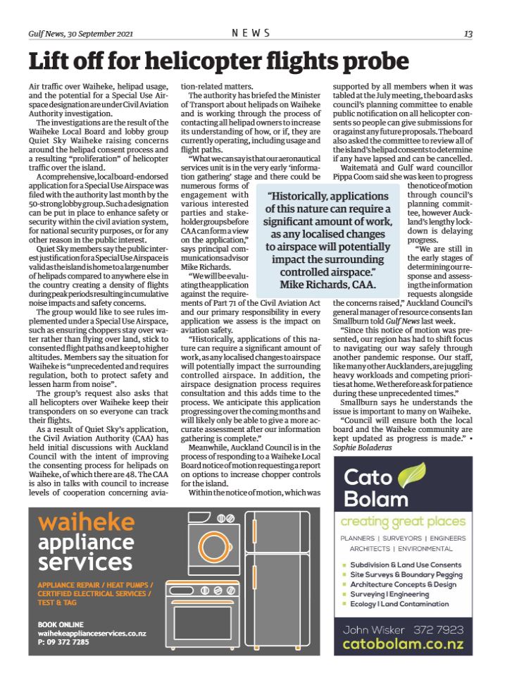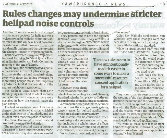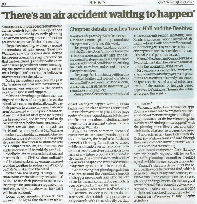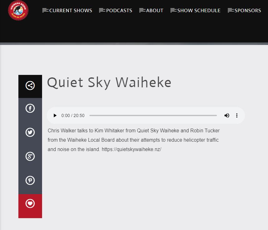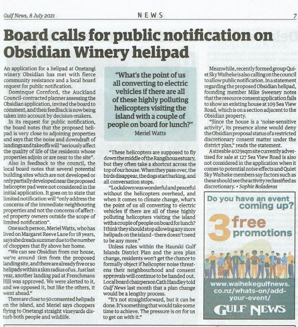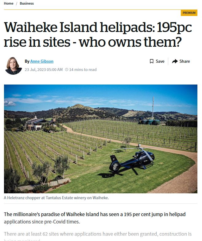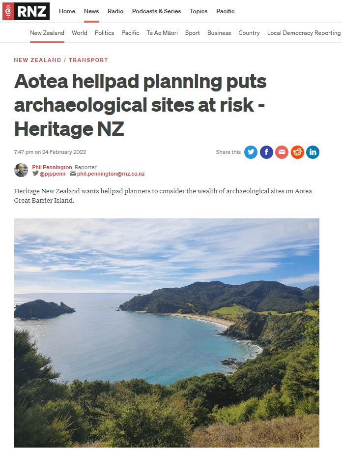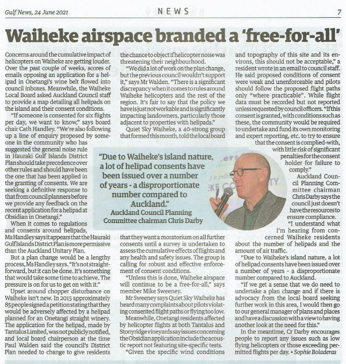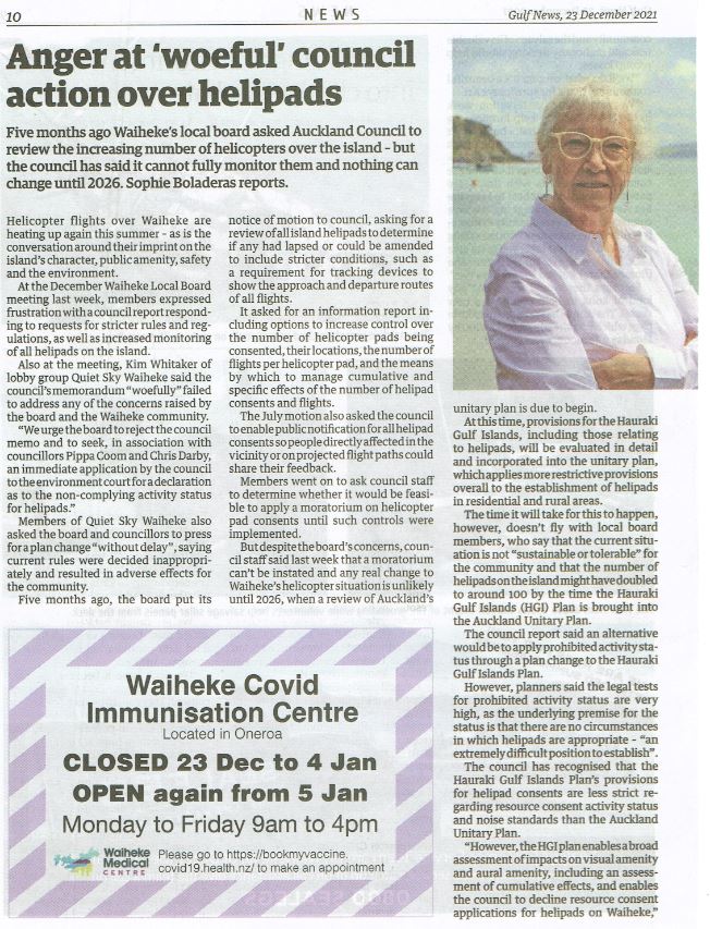 Great Barrier residents are also reeling from unprecedented applications for private helipads on the island. Listen to Radio New Zealand’s interview with Aotea Great Barrier Local Board Chair, Izzy Fordham. Contributions are also made by Quiet Sky’s Kim Whitaker and Waiheke Local Board Chair Cath Handley. You can also read the accompanying article.