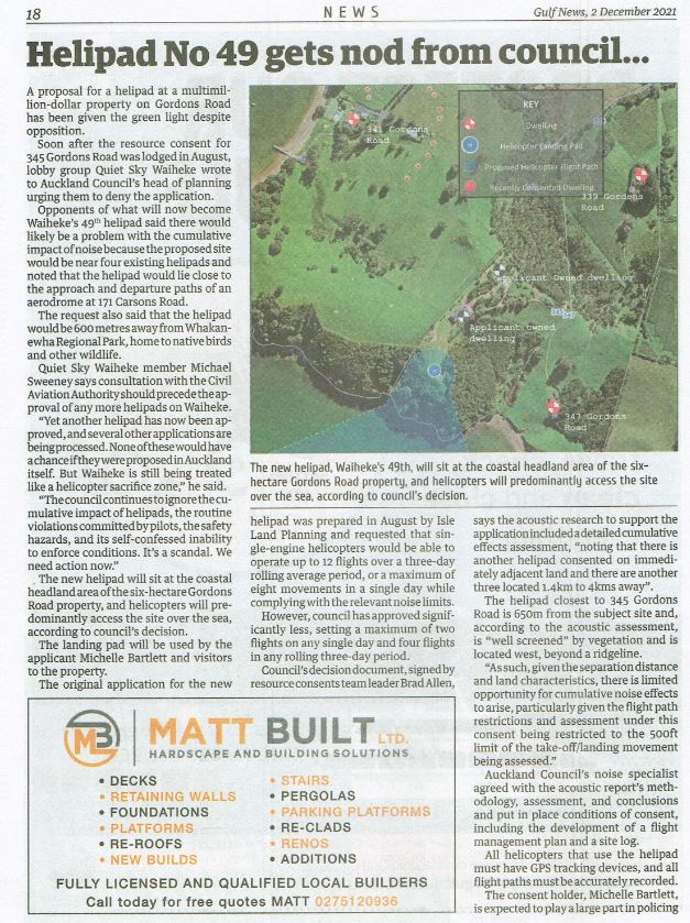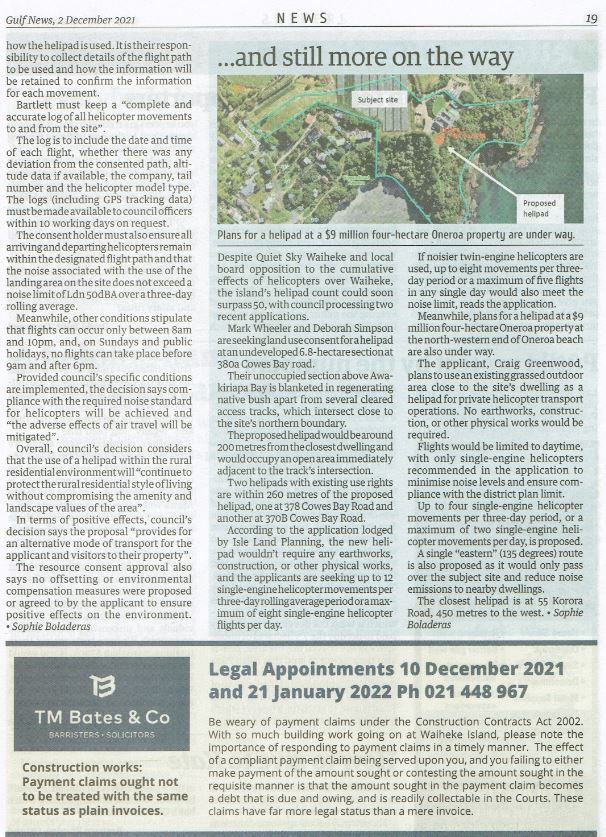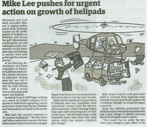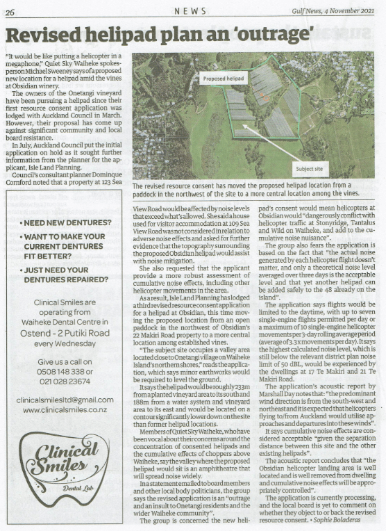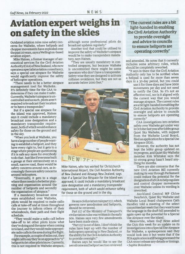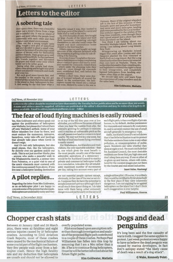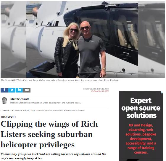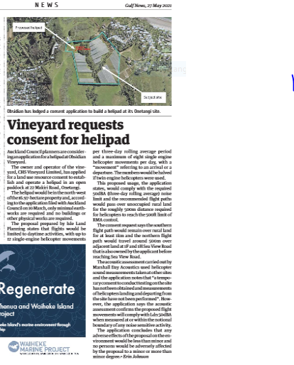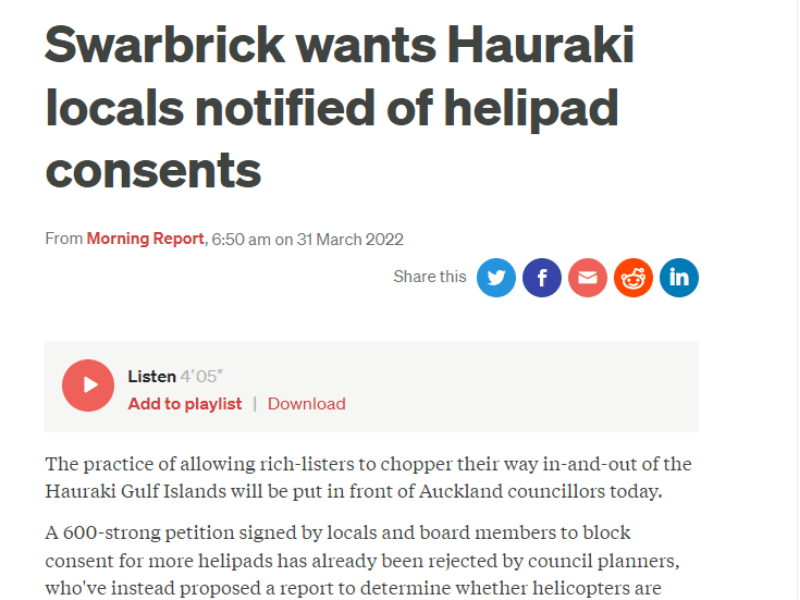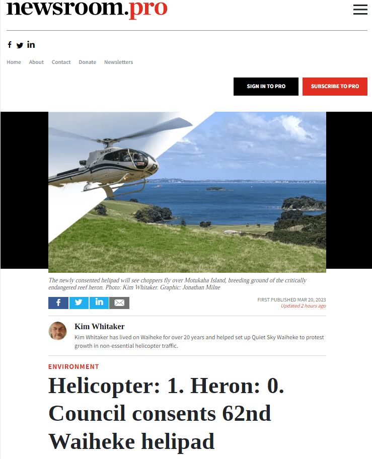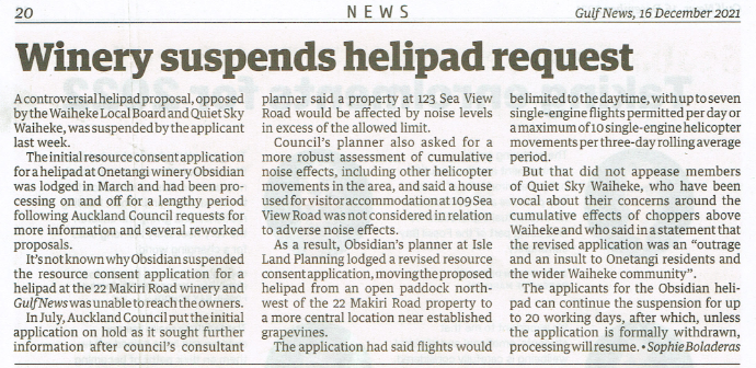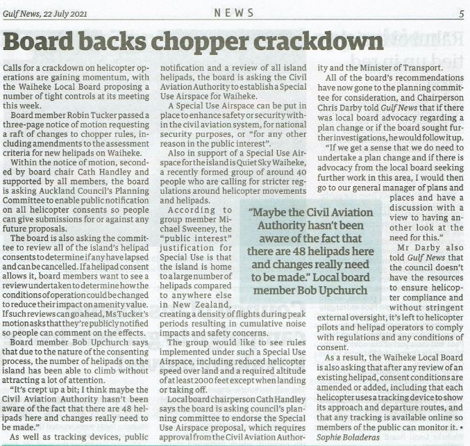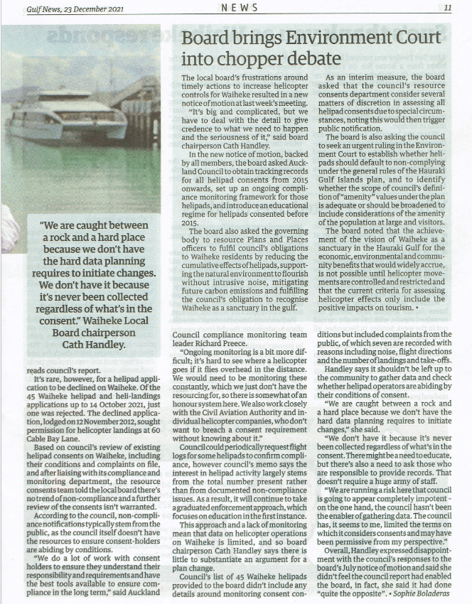 Great Barrier residents are also reeling from unprecedented applications for private helipads on the island. Listen to Radio New Zealand’s interview with Aotea Great Barrier Local Board Chair, Izzy Fordham. Contributions are also made by Quiet Sky’s Kim Whitaker and Waiheke Local Board Chair Cath Handley. You can also read the accompanying article.